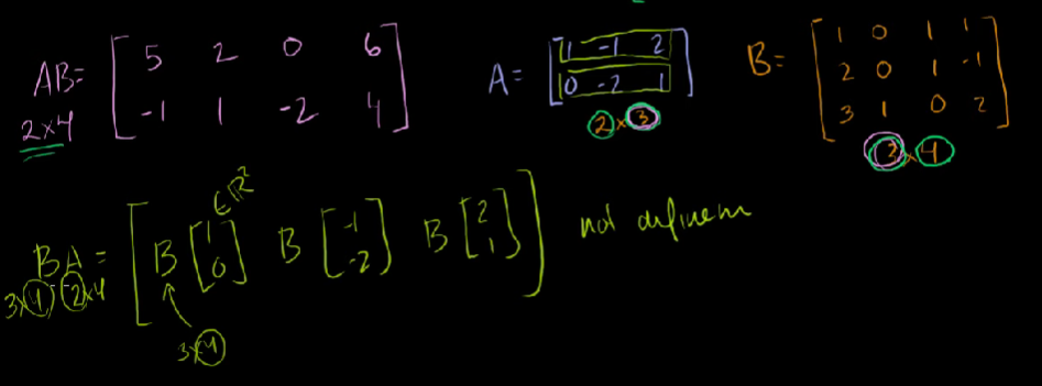 A = [ 1 -1 2; 0 -2 1] , B = [1 0 1 1; 2 0 1 -1; 3 1 0 2;]라고 하자.