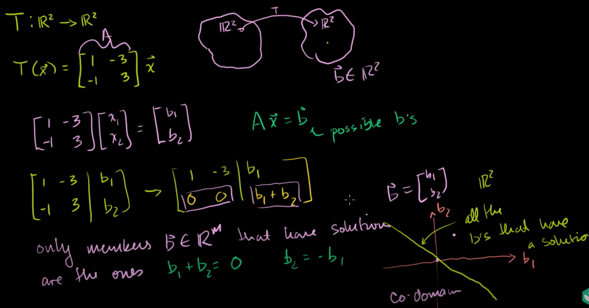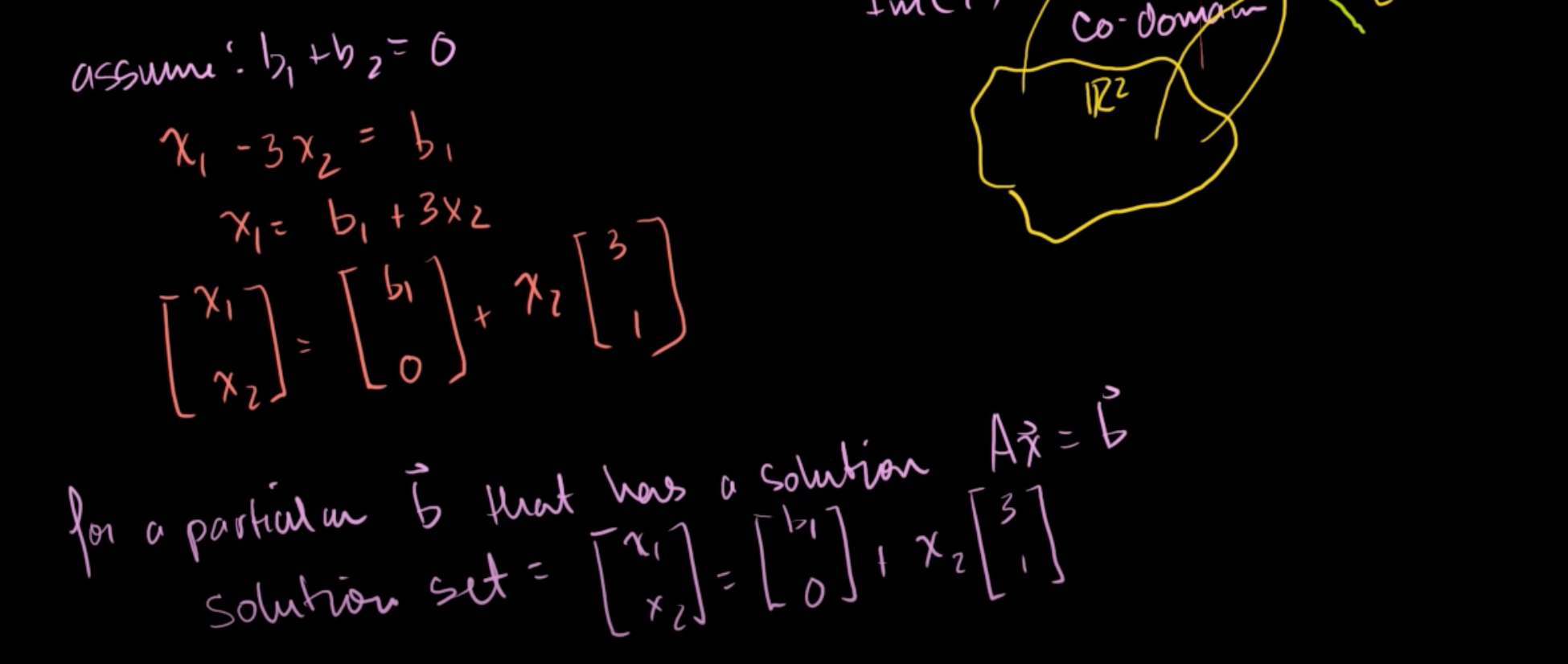 따라서, Ax = b의 해가 존재하도록 하는 b에서 x의 해집합은 [x1; x2] = [b1; 0] + x2[3; 1]을 만족하는 x라고 할 수 있다.