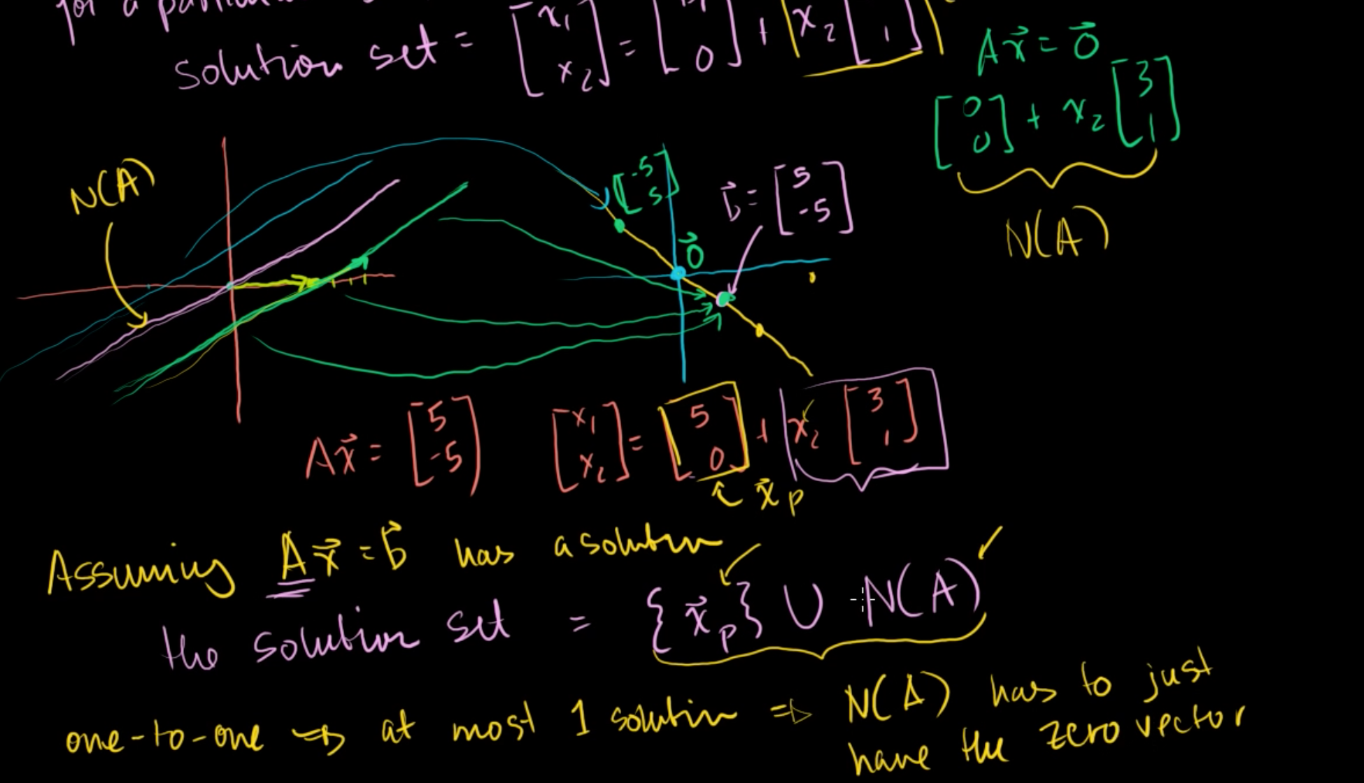 이렇게 Ax = b가 해를 지닌다고 할 때, 해집합은 어떤 벡터 하나와 A의 영공간의 결합으로 나타낼 수 있다.