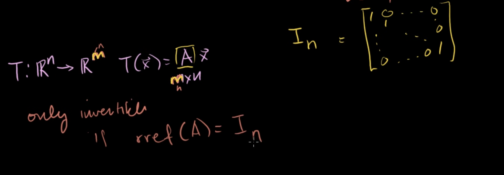변환 T는 Rn -> Rn으로 보내주는 함수이면서 변환 행렬인 A의 기약행사다리꼴행렬이 n x n 단위행렬일 때, 변환 T를 가역적이라고 할 수 있다.