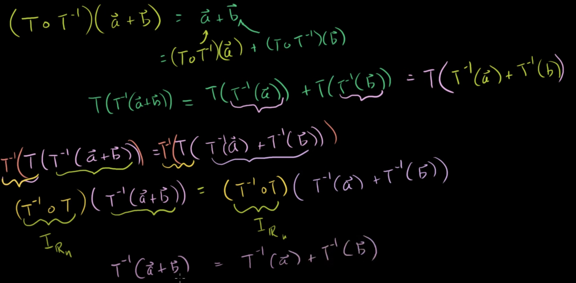 T(T-1(a+b)) = T(T-1(a) + T-1(b)) -> 역행렬을 양변에 곱해준다