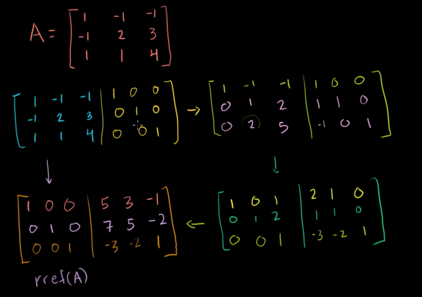 위의 그림과 같이 행렬 A가 있고, A의 기약행사다리꼴 행렬을 구하는 과정에서 더하고 빼는 과정을 한 번 진행했다.