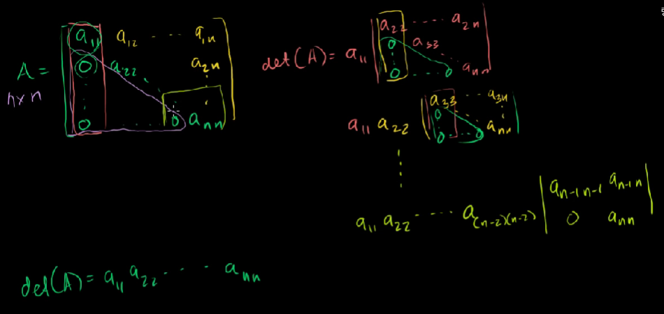 det(A)를 계산해보면, a11[A2~n] = a11*a22[A3~n] 과 같이 계속 분리해나갈 수 있다.
