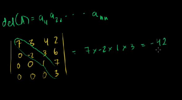 det([7 3 4 2; 0 -2 3 6; 0 0 1 7; 0 0 0 3]) = 7*(-2)*1*3 = -42
