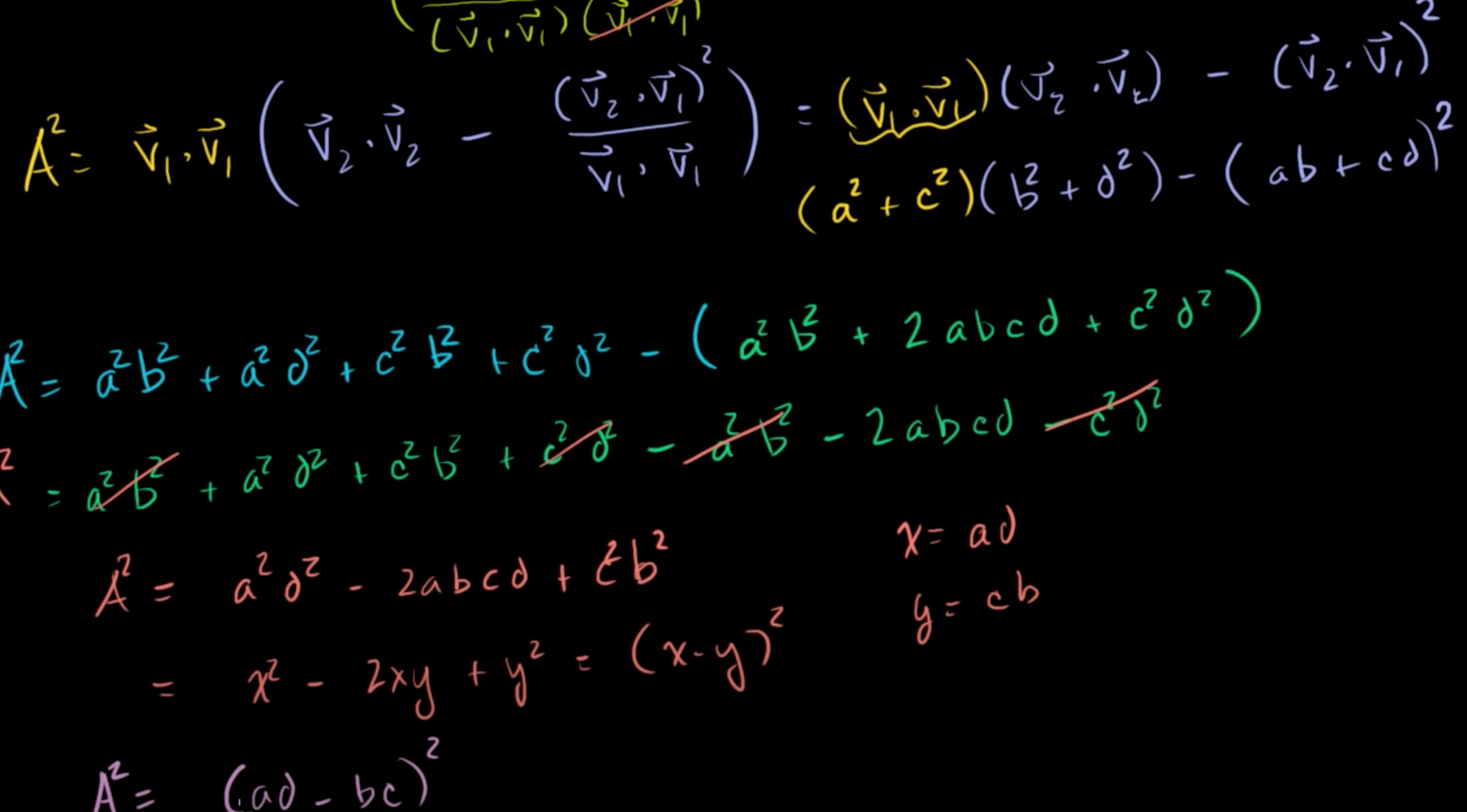 A² = (V1·V1) * (V2·V2 - (V2·V1)(V2·V1) / (V1·V1))