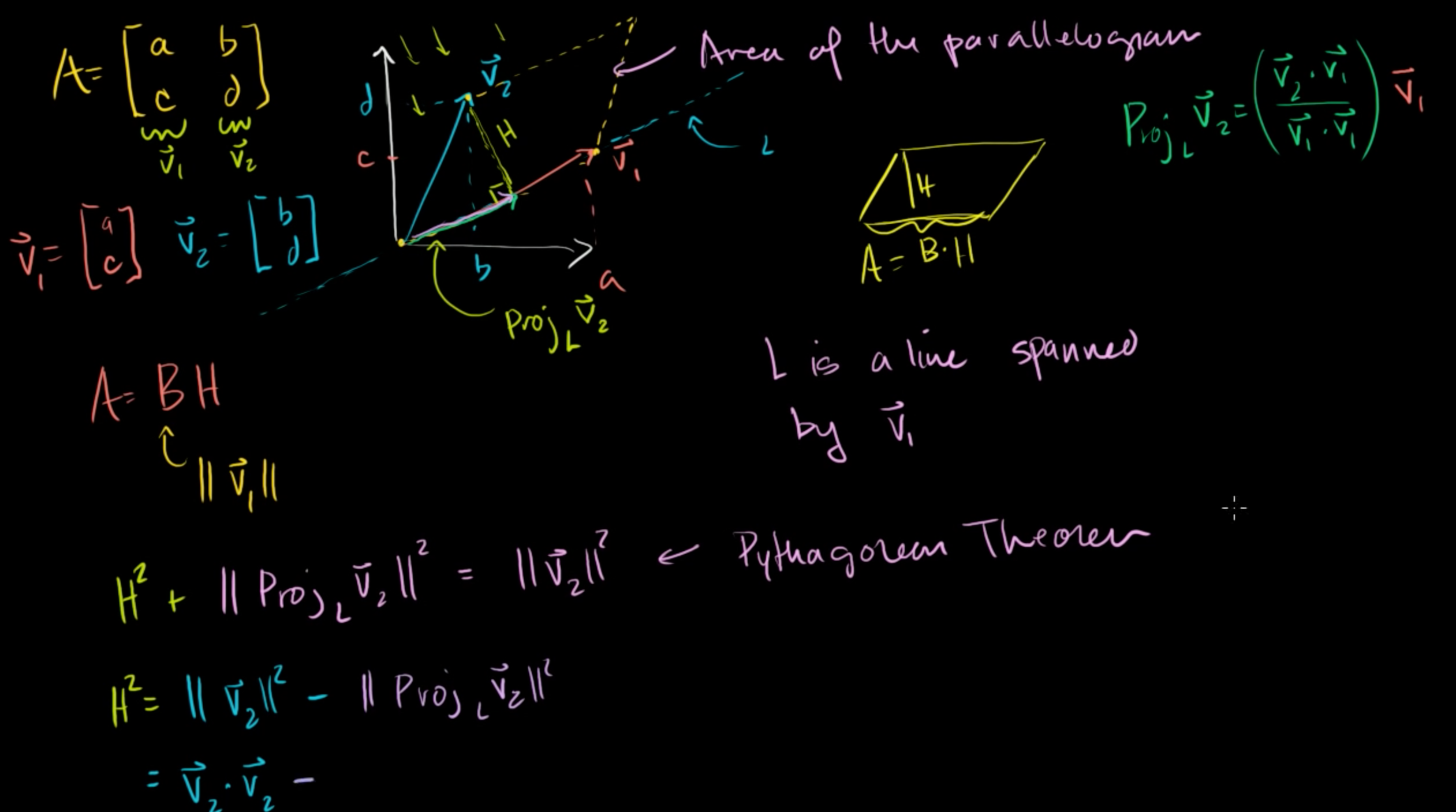 H² = V2·V2 - ||{(V2·V1) / (V1·V1)} V1 ||²