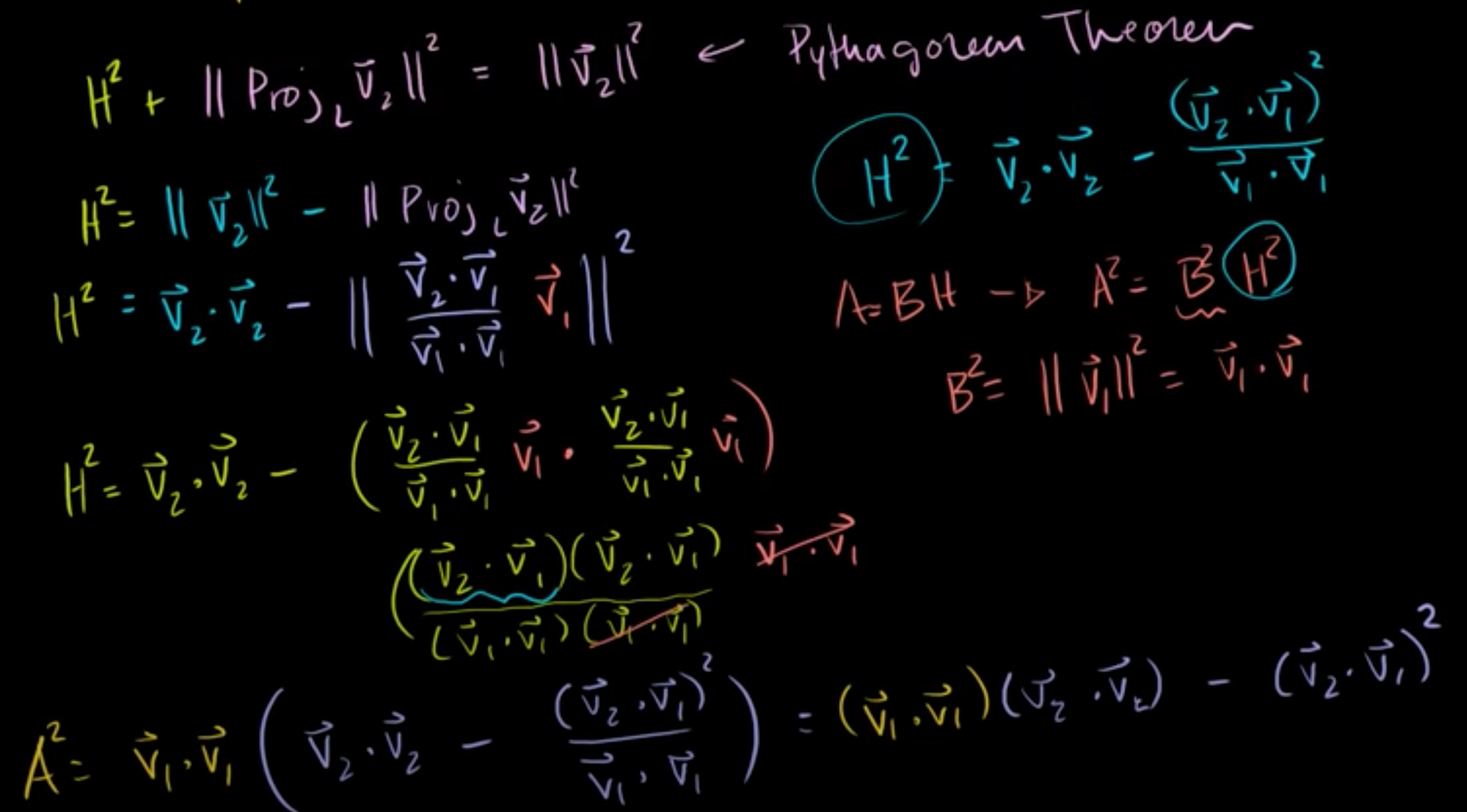 H² = V2·V2 - {(V2·V1)(V2·V1) / (V1·V1)(V1·V1)}*(V1 ·V1)