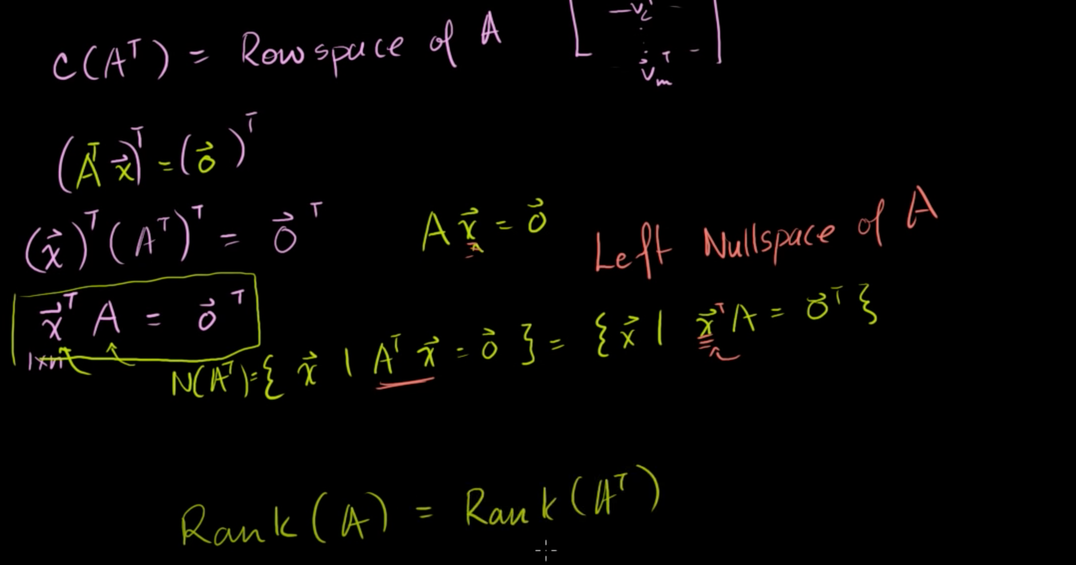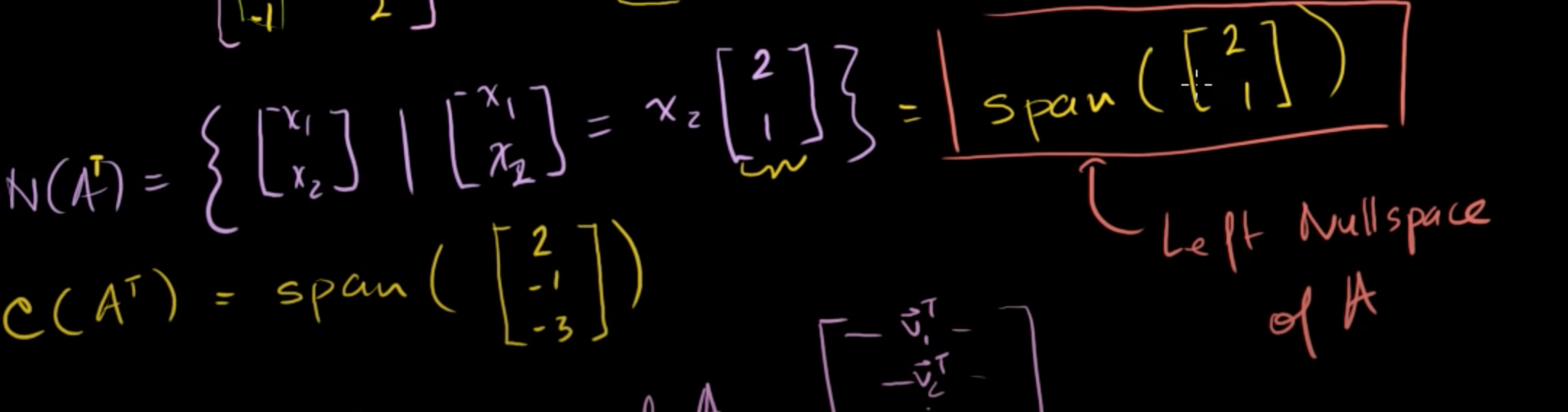 보통의 영공간에서는 x가 오른쪽에 있지만, 전치행렬의 특성을 이용하여 전치행렬의 영공간을 구하면 전치벡터가 A의 왼쪽에서 곱해진다.