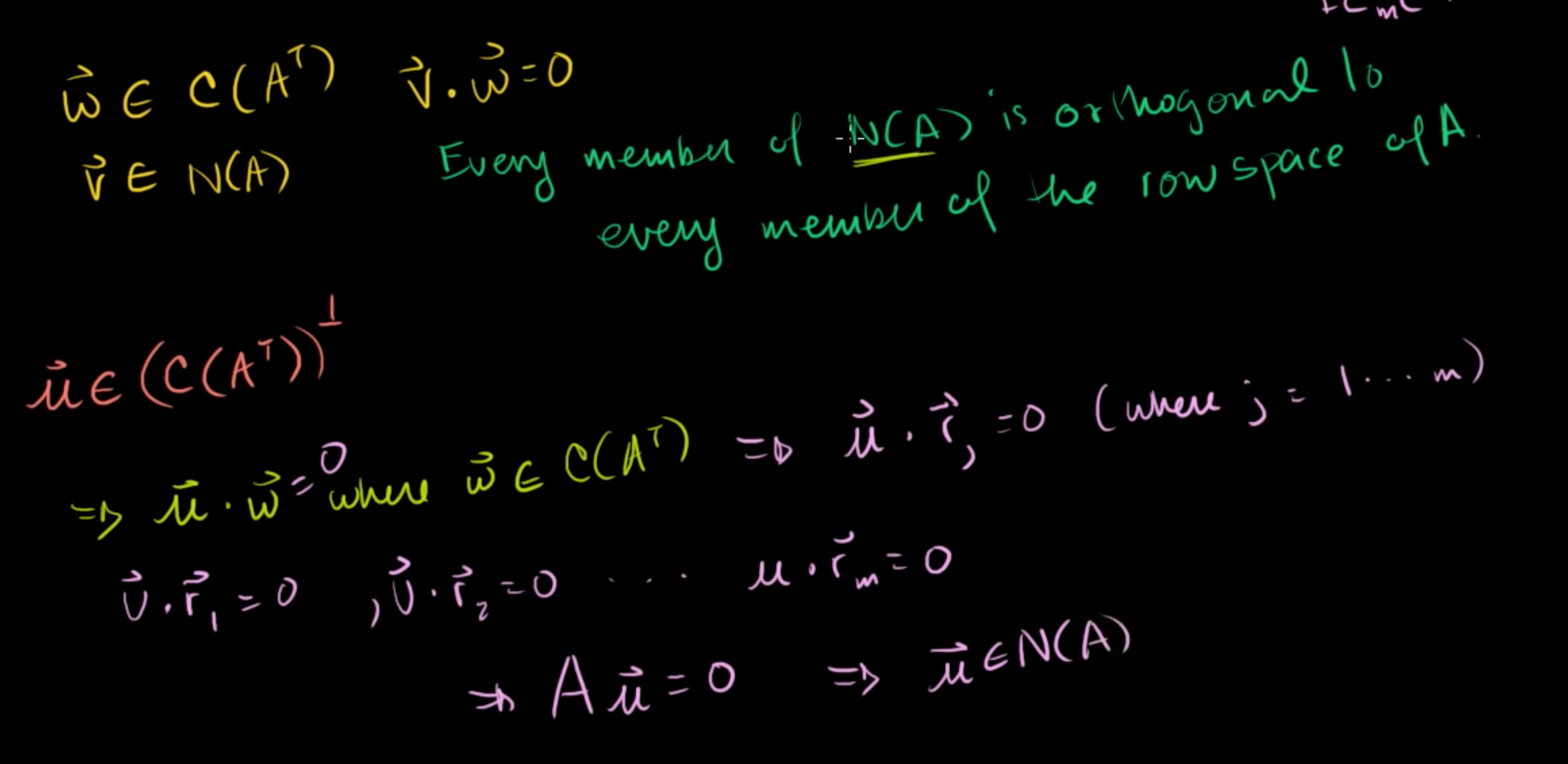 u ∙ w = 0 이고, u는 A의 모든 행벡터(rj)와 내적하면 0이 된다.