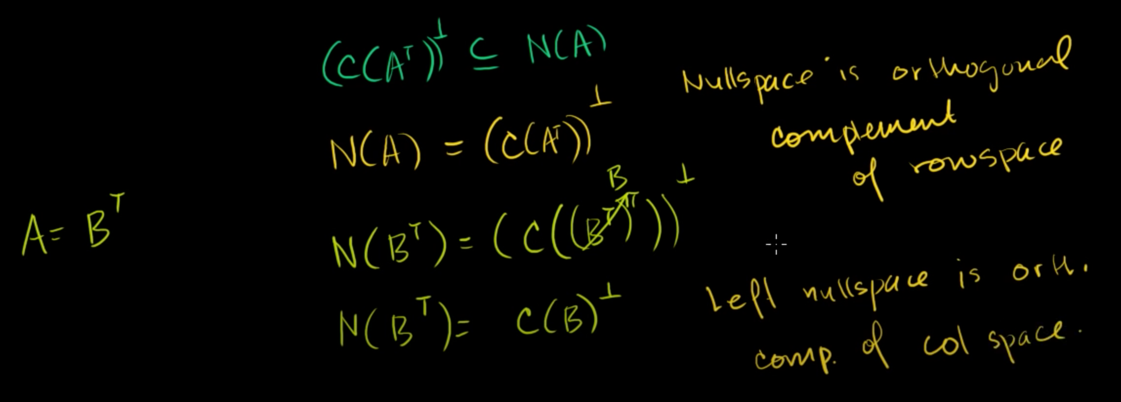 간단히 정리하면 BT의 영공간은 B의 열공간의 직교여공간과 동일하다.