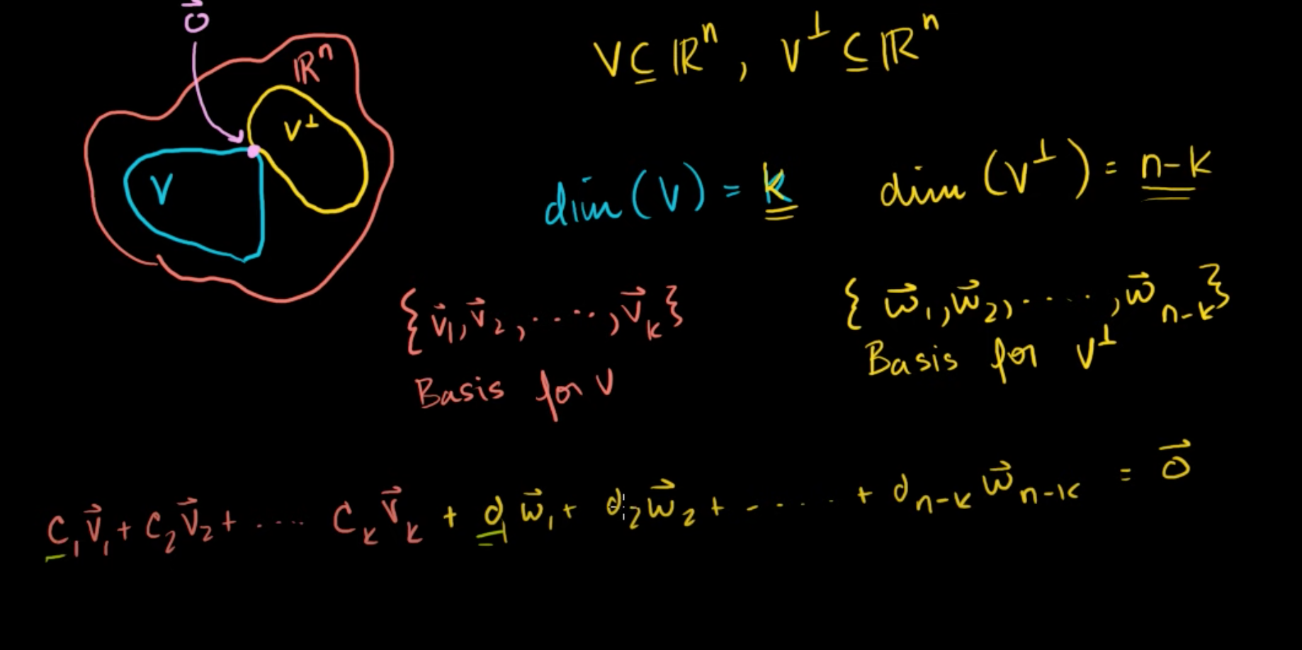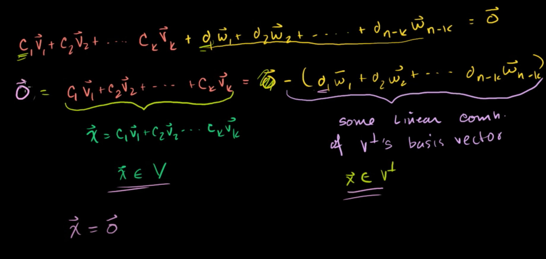 그 말은 즉, (c1v1+c2v2+ ... + ckvk) = 0 이고, (d1w1+d2w2+ ... + d(n-k)w(n-k)) = 0 이어야만, 두 벡터의 합이 0이 된다는 것이다.