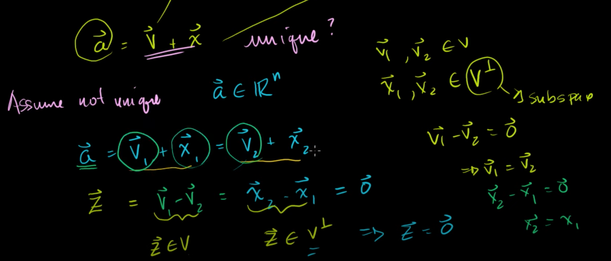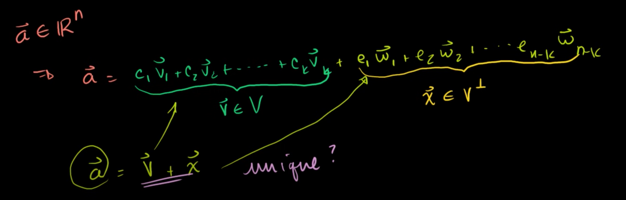 따라서, Rn의 원소를 부분공간 V의 벡터와 V의 직교여공간의 벡터의 합으로 나타내는 데에는 한 가지의 고유한 방법만이 존재한다.