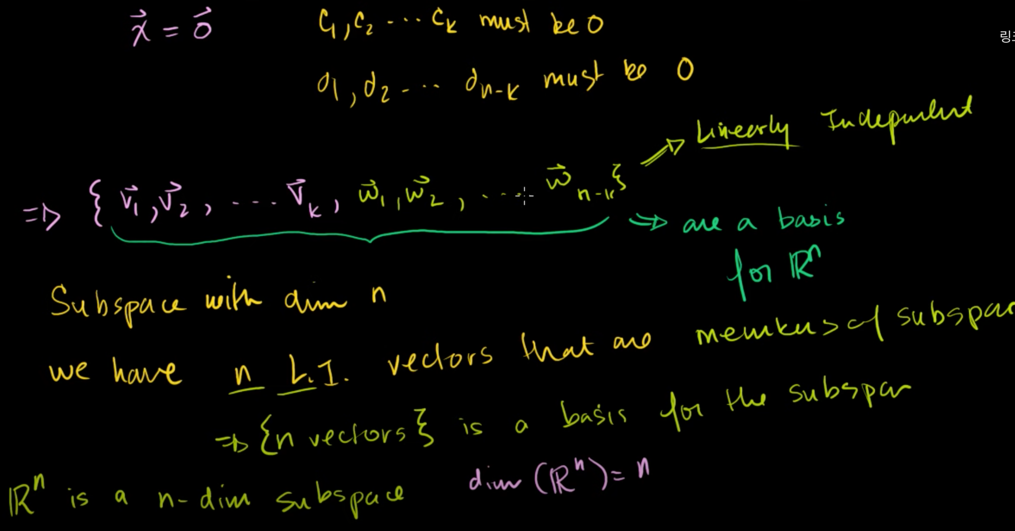 v1, v2, ..., vk, w1, w2, ..., w(n-k)는 모두 선형독립이고, Rn의 기저벡터가 된다.