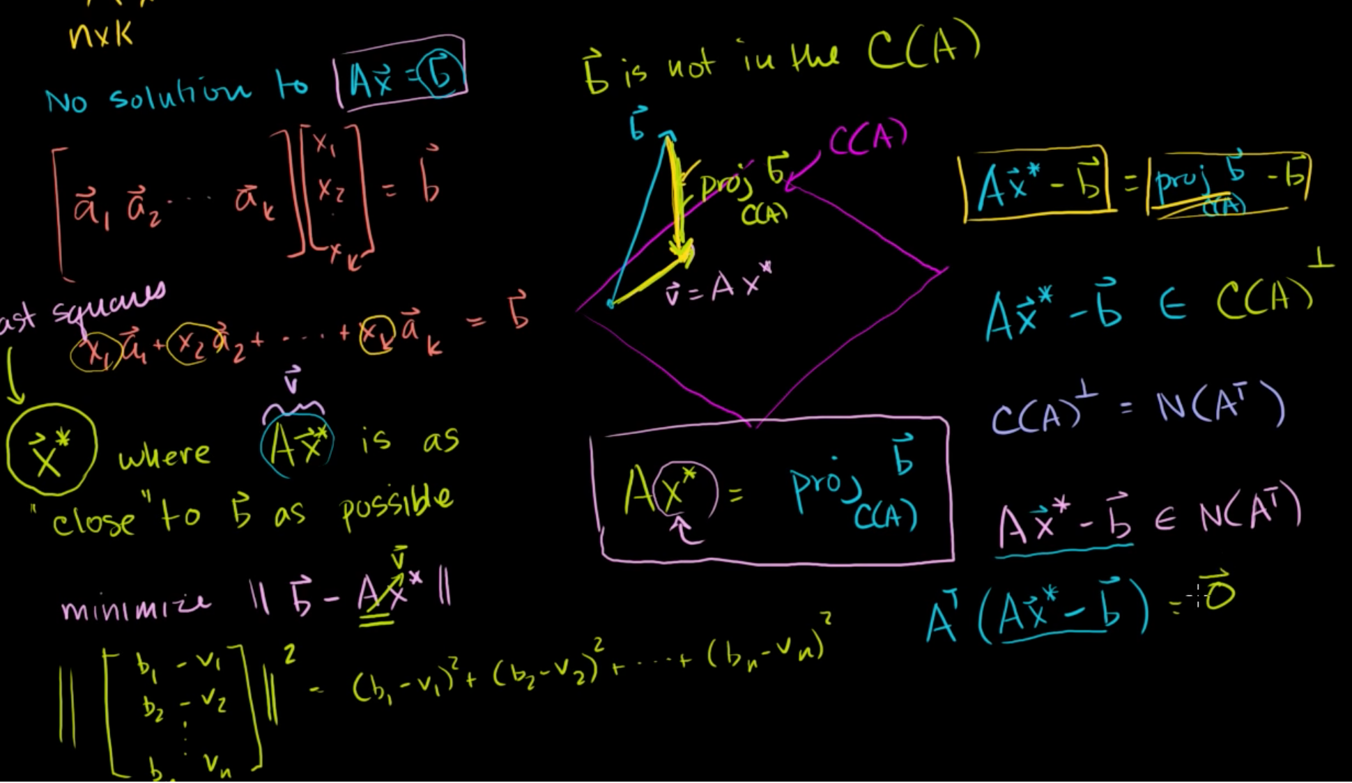 그림을 보면, Ax*는 C(A)상에 존재하고, Ax*-b는 C(A)와 직교하는 벡터가 된다.