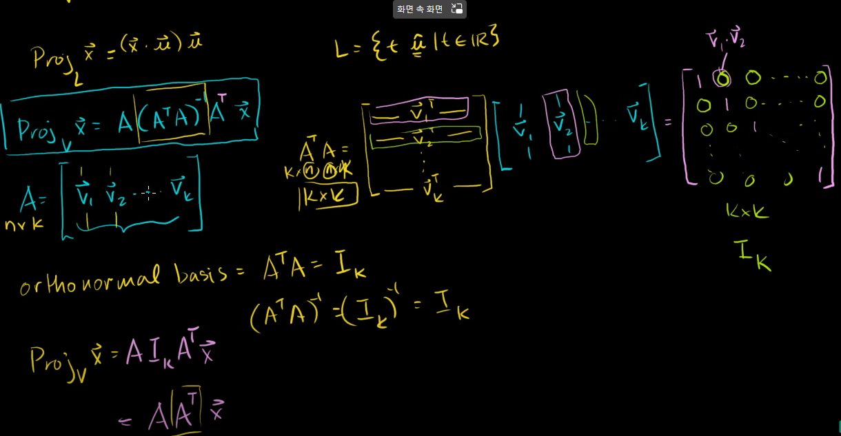 projVx = A(ATA)-1ATx 에서 A = [v1, v2, ..., vk]라고 했다.