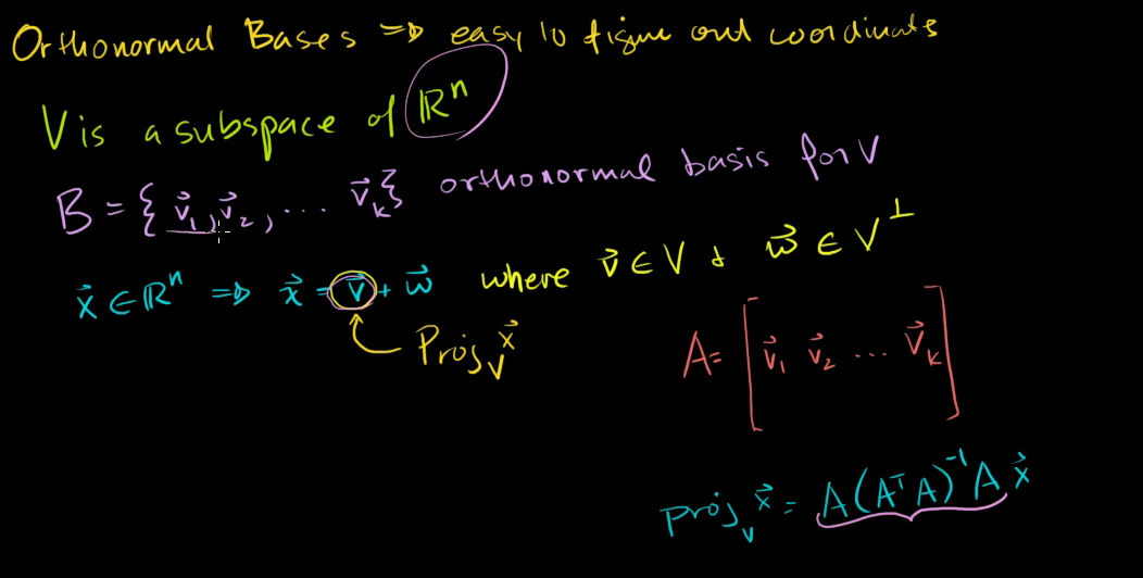 x를 V에 투영하는 것은 A와 AT의 곱인데, A는 열벡터들이 부분공간 V의 기저벡터인 행렬이다.