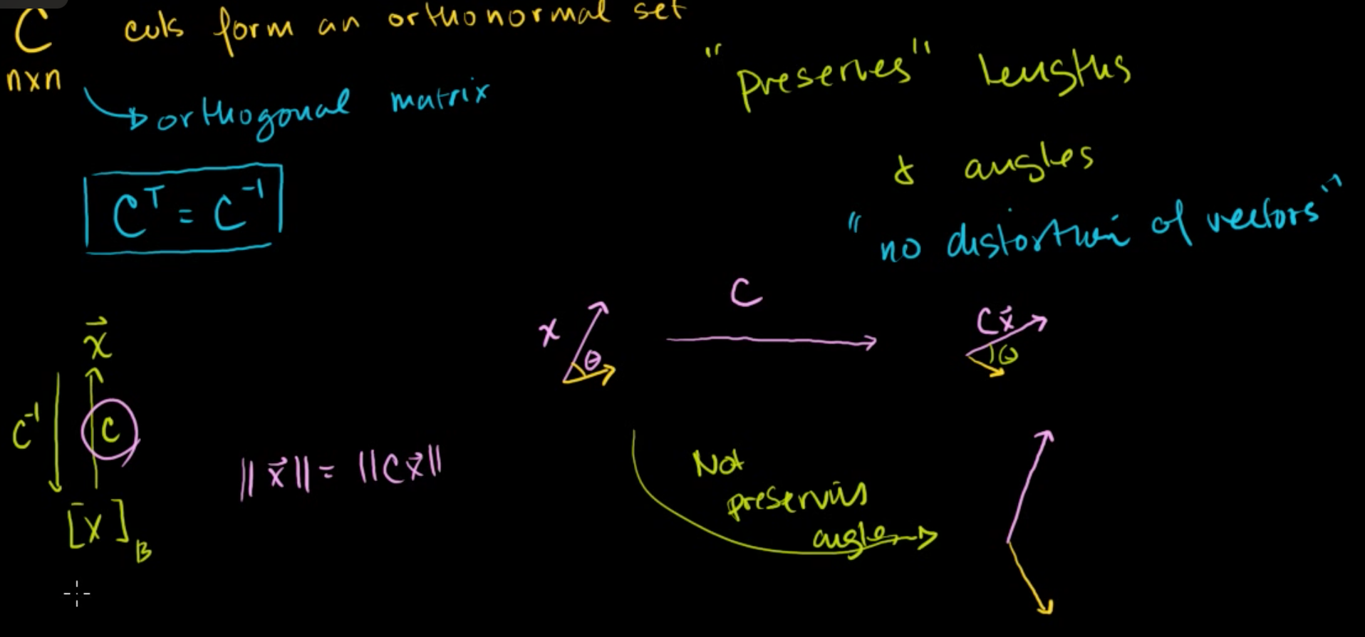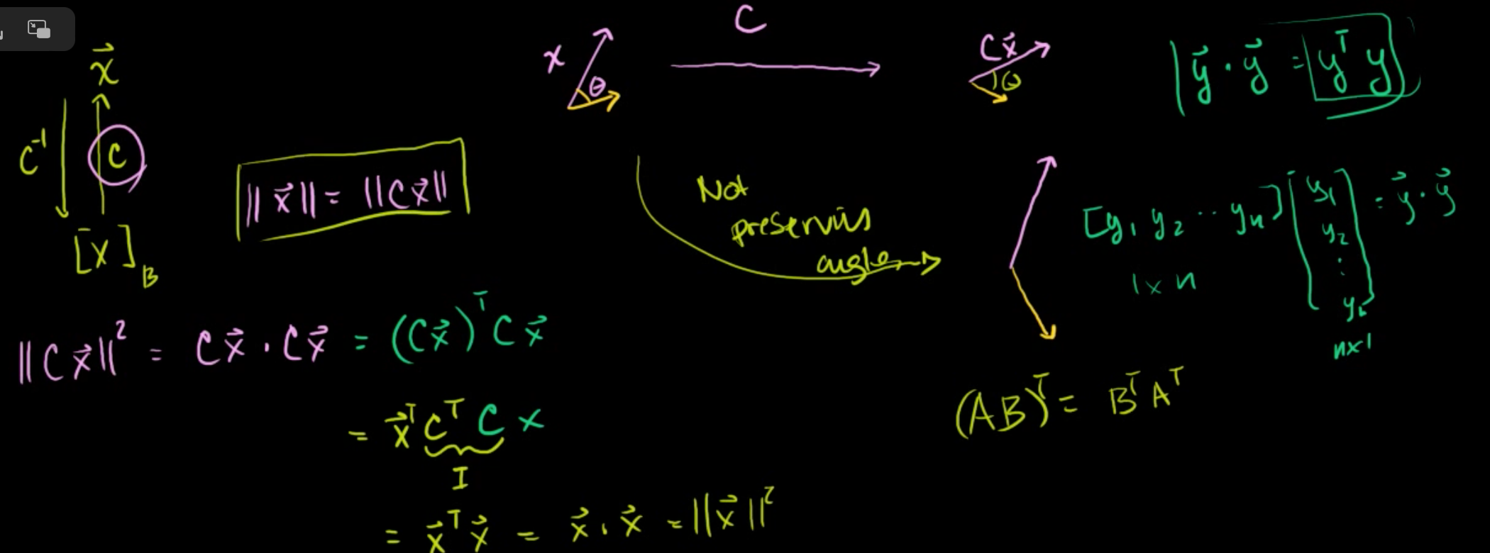 그림으로 표현하면 분홍색 벡터 x가 θ라는 각을 이루고 있으면, C를 곱해서 변환하면 길이는 Cx 각도는 θ가 될 것이다.