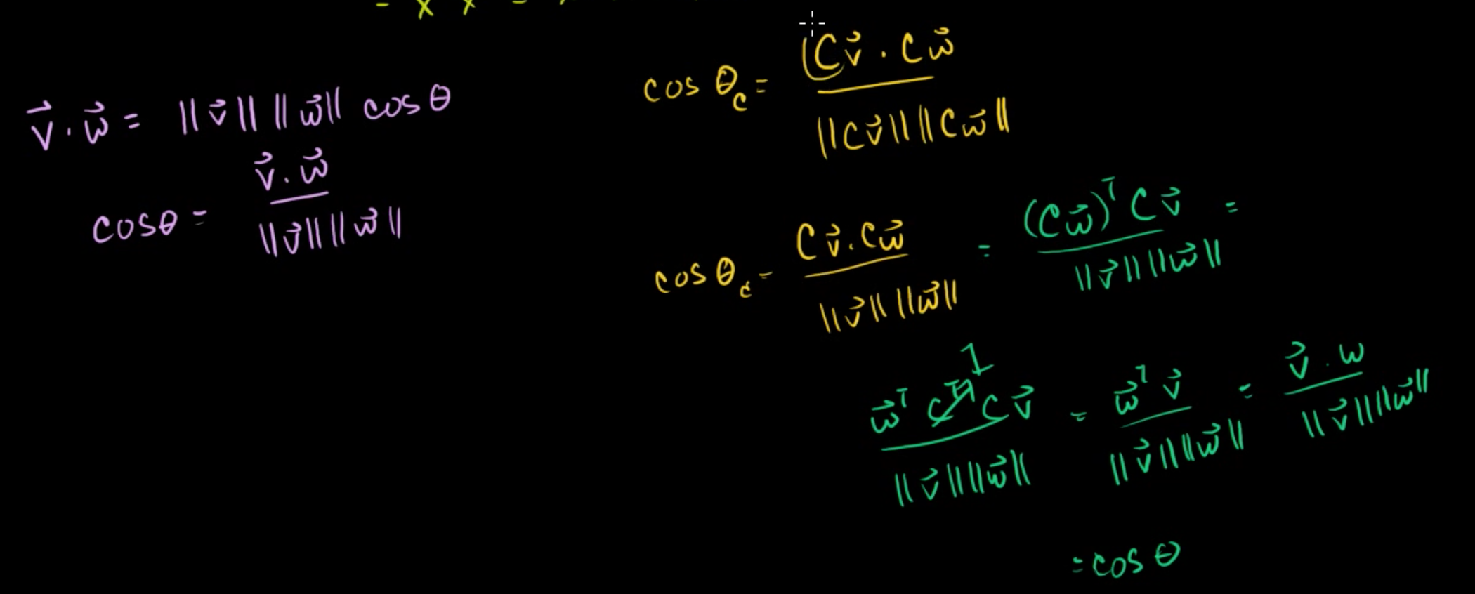 cosθc = ( (Cw)TCv ) / ( ||v|| ||w|| )