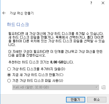 5. 가상하드디스크는 VDI방식, 고정크기, 32GB로 설정.