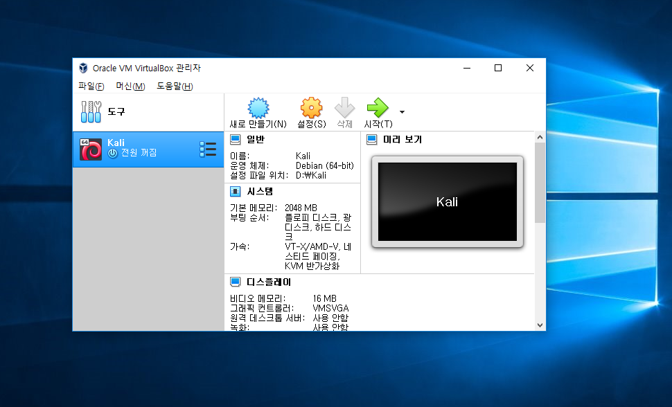 7. 이제 가상하드를 실행하고, 칼리 리눅스를 설치하도록 하자.