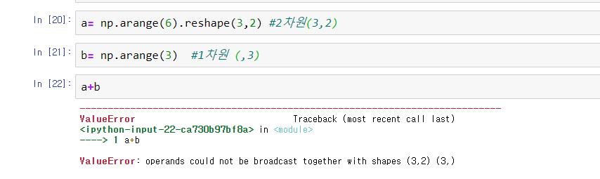 규칙 3 : 두 배열의 차원이 다르고, 행열도 다르며, 1도 없으면 오류가 발생함.