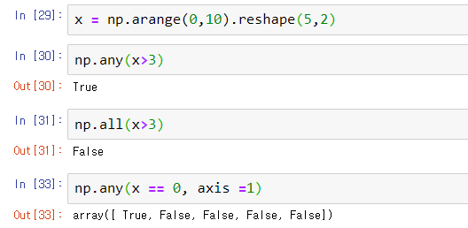 다차원 행렬의 경우, axis를 정해서 검사할 수도 있음. (axis = 0 이면 세로, axis = 1 은 가로)