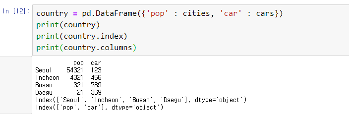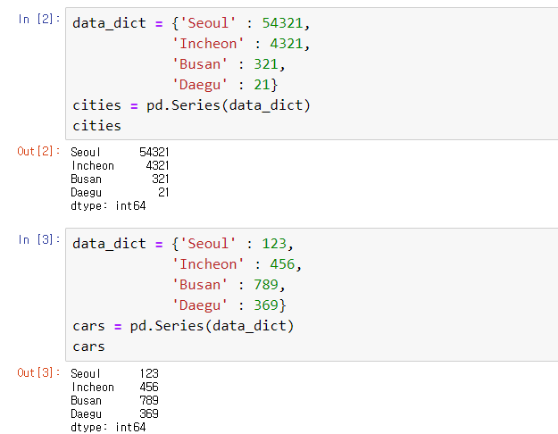 2) 다수의 Series를 이용해 만들 때는 딕셔너리처럼 생성하면 된다.