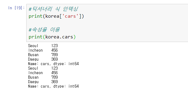 열에 접근하는 방식은 인덱싱을 이용 또는 속성을 이용하는 방법이 있다.