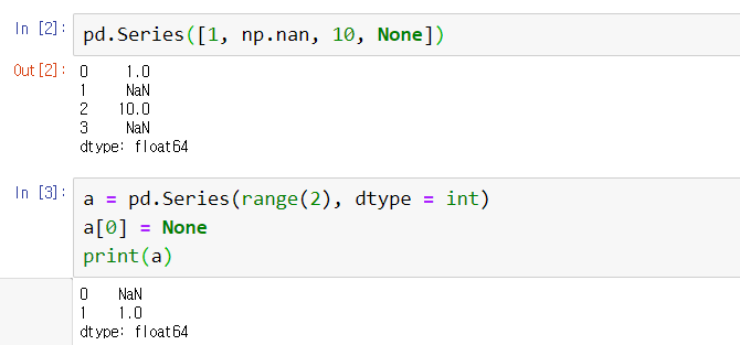 Pandas에서 None은 자동으로 nan으로 변경한다.