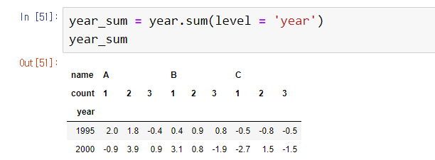 data.mean( level = 'name' ) 으로 mean, sum, max 등의 집계 메소드를 사용할 수 있다.