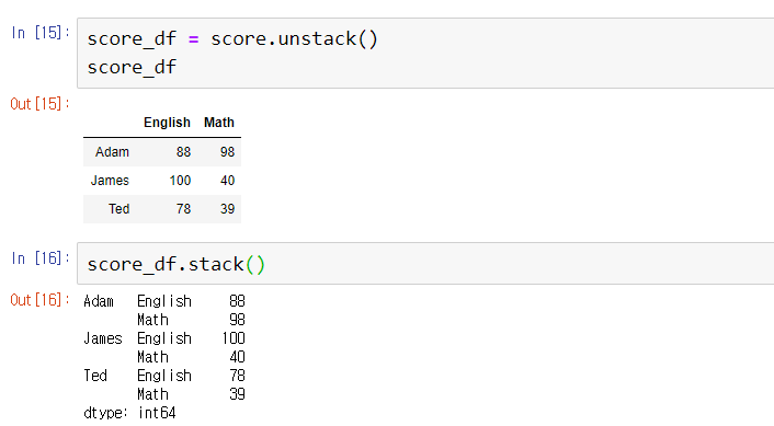 data.unstack( ) 으로 다중 인덱스를 해제하거나 재설정할 수 있다.