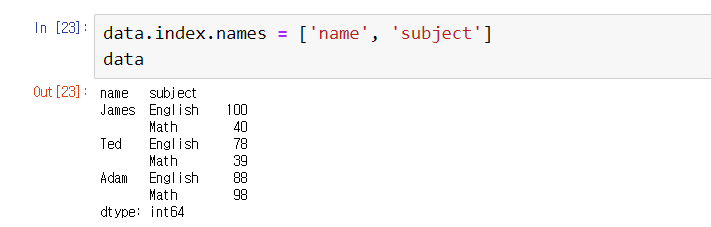 data.set_index( ['name', 'name'] ) 으로 원시데이터를 다중인덱스를 가지는 dataframe으로 만들 수 있다.