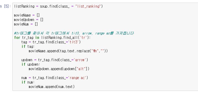 예제로 만든 코드는 네이버 영화에서 영화 순위, 이름, 변동여부, 변동등수를 가져오는 코드입니다.