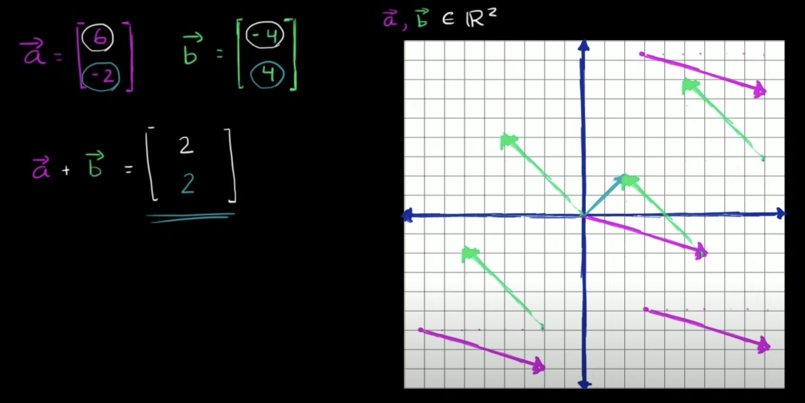 보라색 벡터는 모두 다 같은 벡터 a이며, 녹색 벡터들은 모두 다 벡터 b이다.