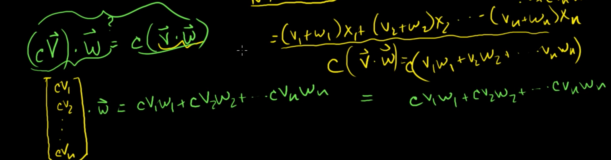 스칼라 c와 어떤 벡터 v에 곱하고 w를 내적한 값이, 벡터 v와 w를 내적한 값에 스칼라 c를 곱한 값이 같다면 결합법칙이 성립한다.