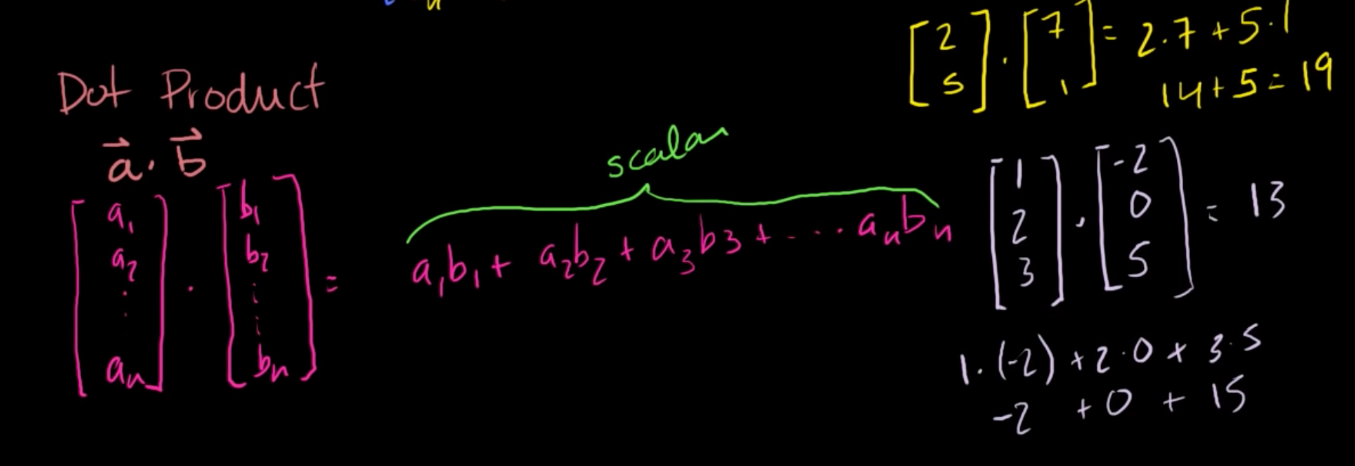 그러므로 a1 × b1 + a2 × b2 + ... + an × bn 이 되며, 이 값은 벡터가 아닌 단순 실수인 스칼라 값을 가지게 된다.
