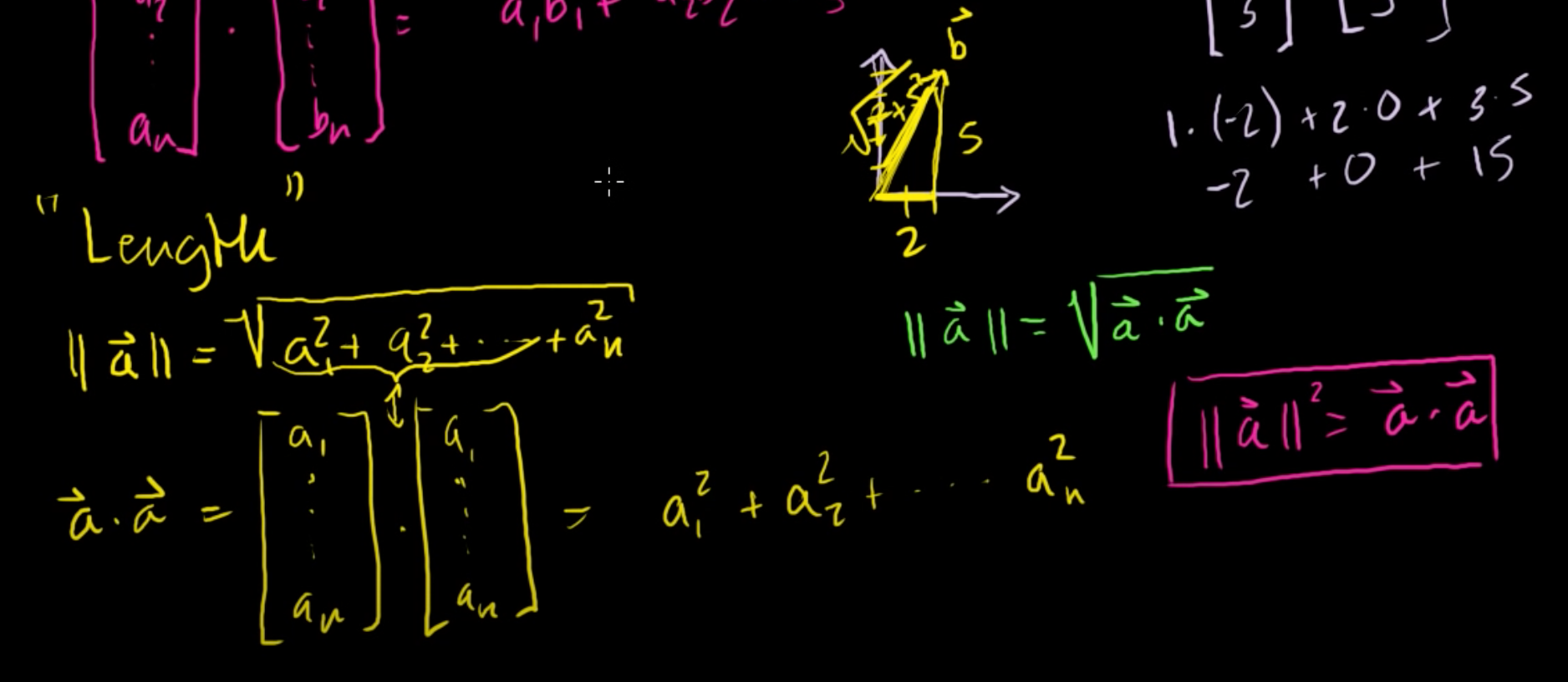 또한 양쪽을 제곱하면, 길이의 제곱은 벡터 a와 그 자신을 내적한 것과 같다고도 할 수 있다.