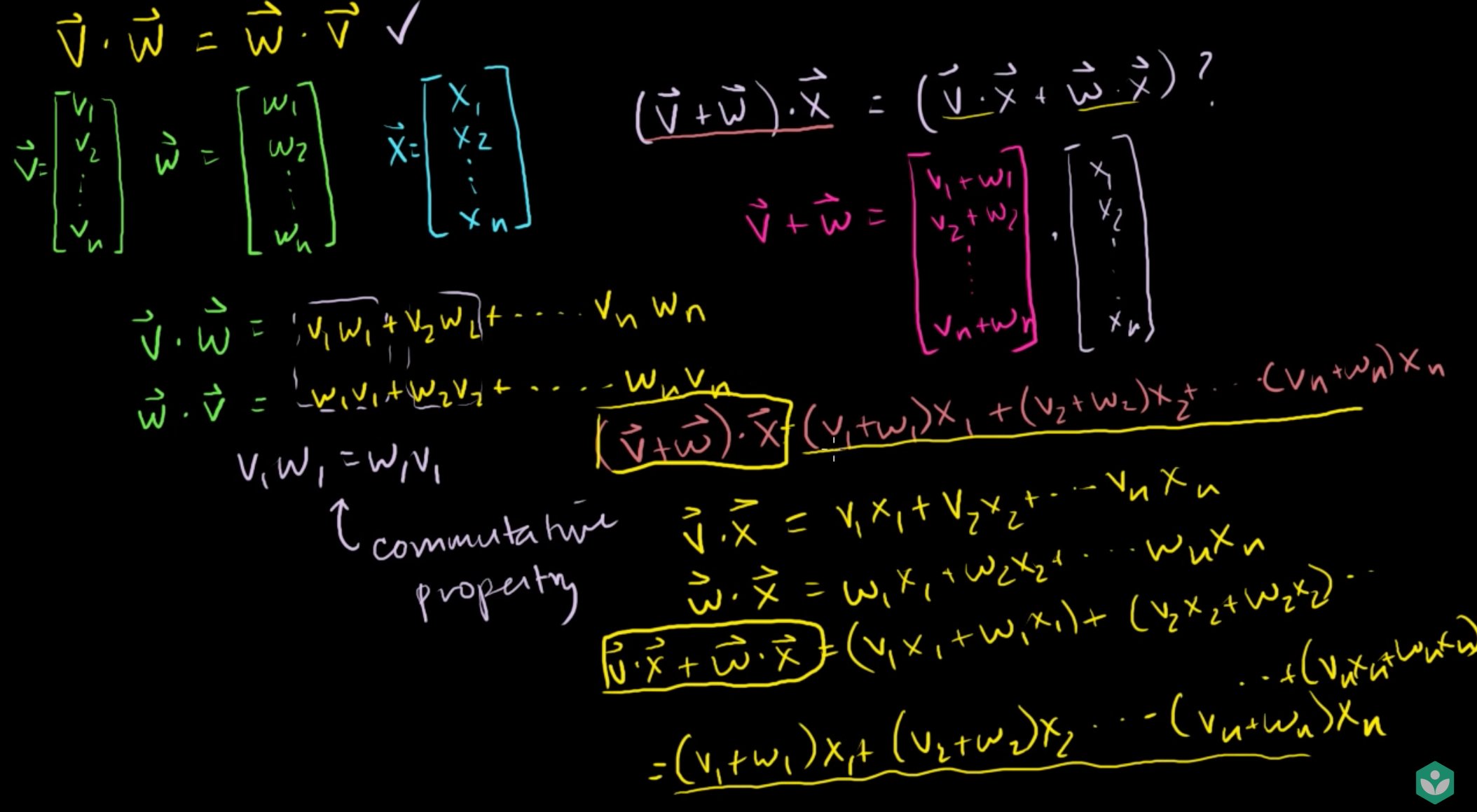 즉, (v + w) · x = (v1 + w1) × x1 + (v2 + w2) × x2 + ... + (vn + wn) × xn 이다.