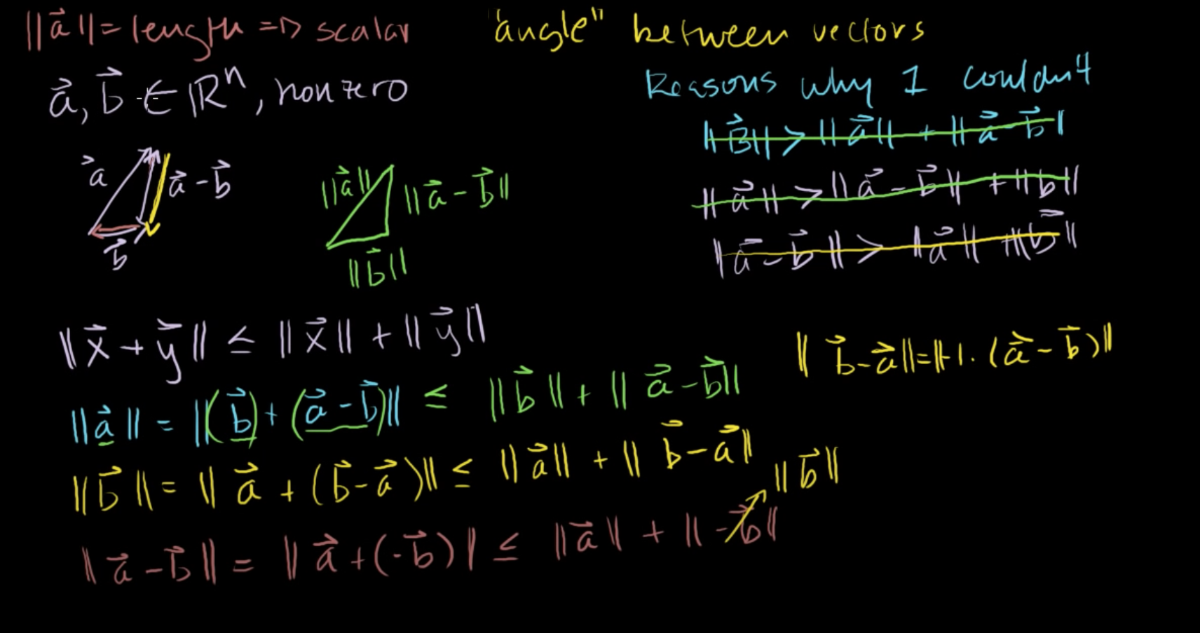 성분의 개수를 알 수 없는 Rⁿ의 원소인 벡터 a, 벡터 b, 벡터 a-b의 길이로 정의된 삼각형을 그리면 위와 같다.