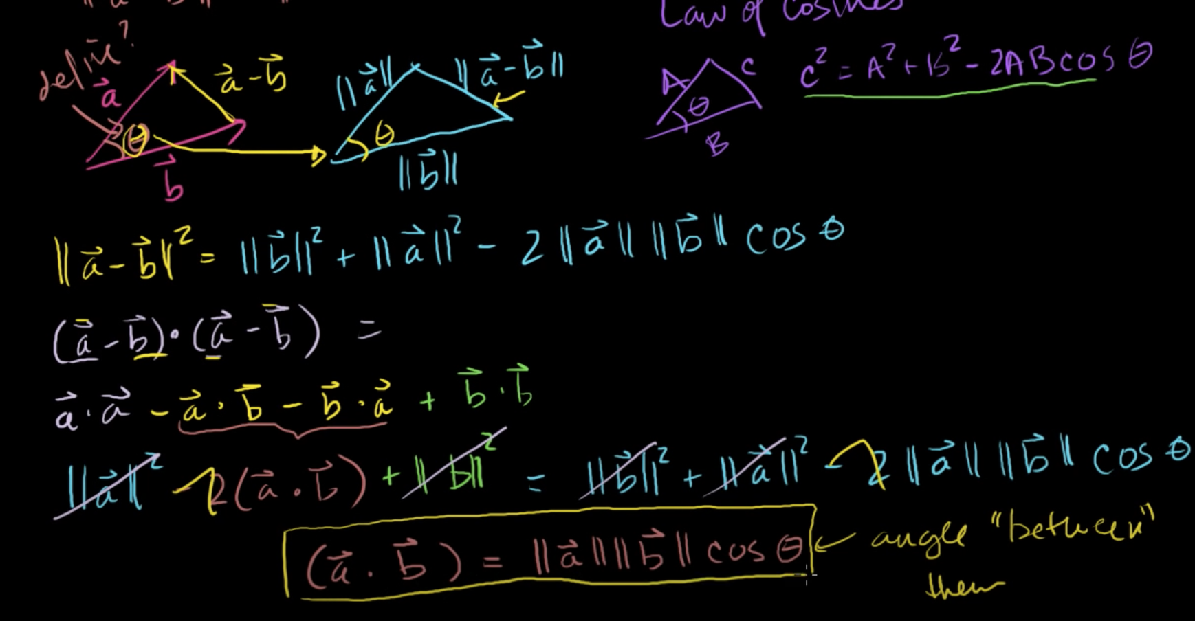||a||² - 2a·b + ||b||² = ‖a‖² + ‖b‖² -2‖a‖‖b‖cos(θ)