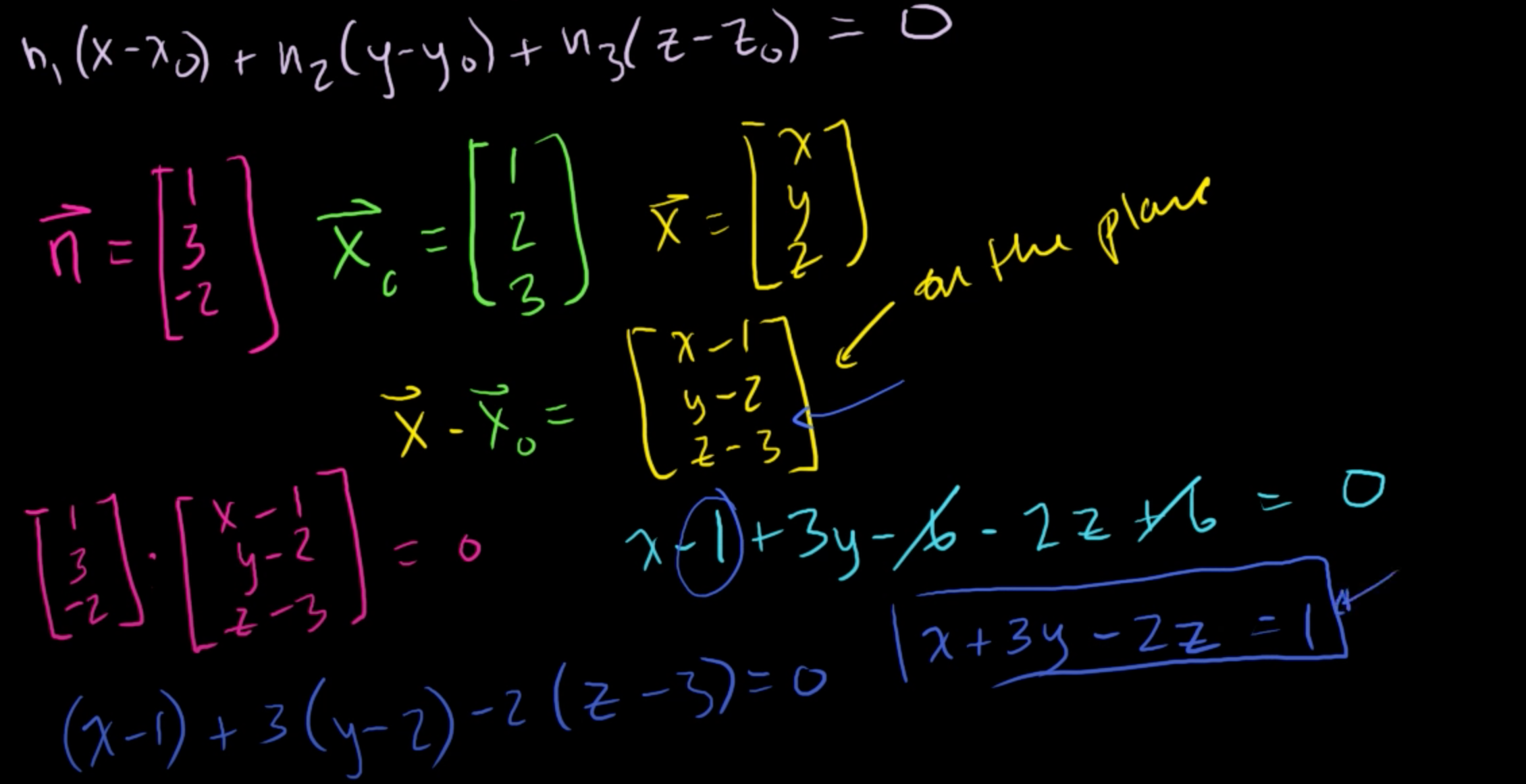 두 점의 차이를 구해보면, x-x0=[x-1; y-2; z-3] 이고, 이 것은 면 위에 존재한다.