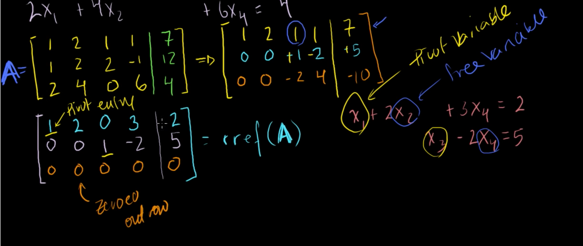 이 식들에서 피벗변수를 구하기 위해, 자유변수는 어떠한 값이든 선택할 수 있다.