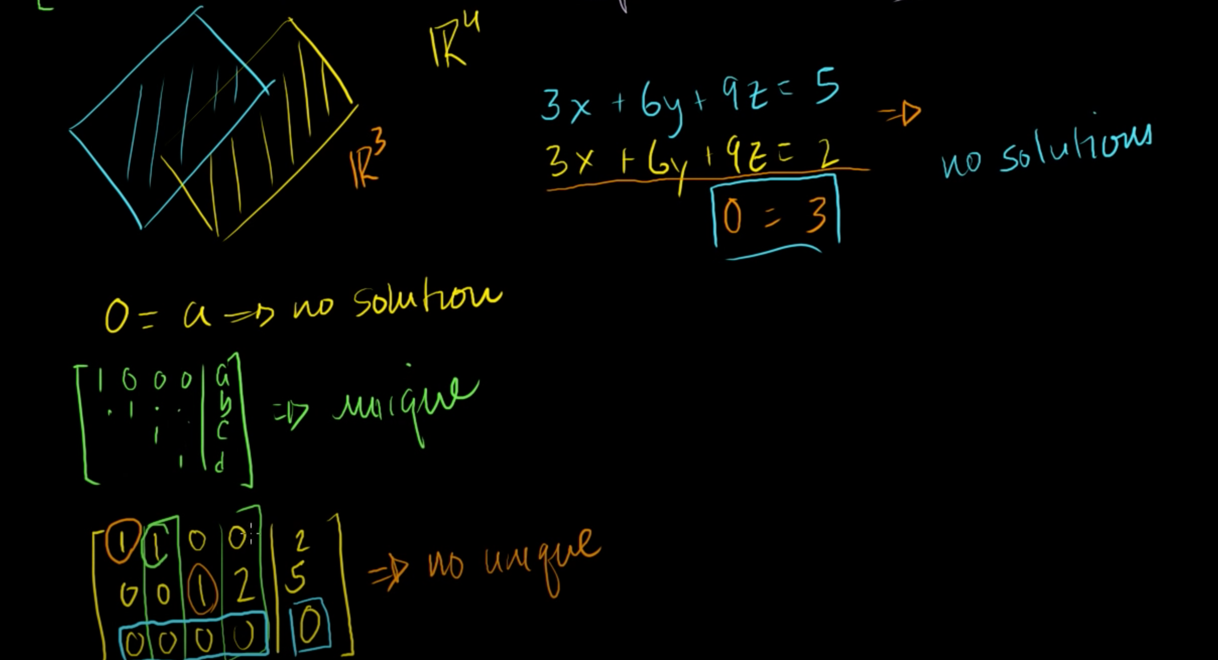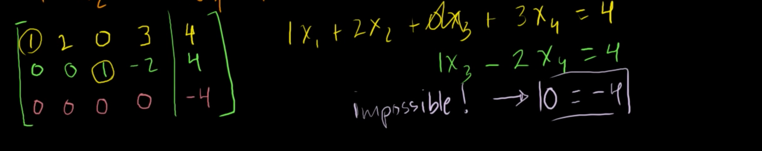 그러므로, 기약행사다리꼴행렬 혹은 단순 소거법을 사용하여 연립 방정식을 풀 때, 0이 어떤 수와 같다는 식에 도달하게 되면 해가 없다고 할 수 있다.