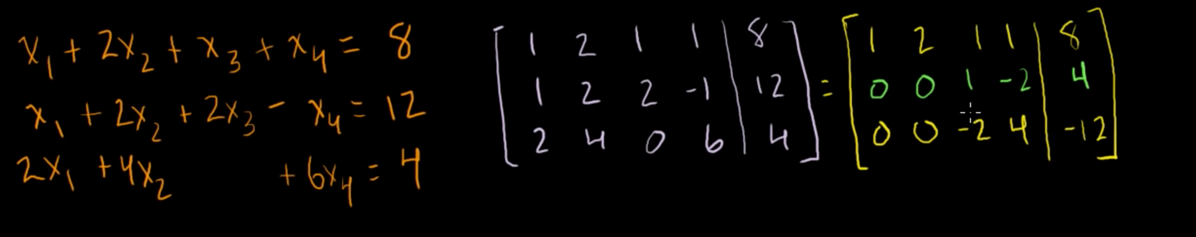위와 같이 네 개의 변수로 이뤄진 세 개의 선형방정식들이 있다.
