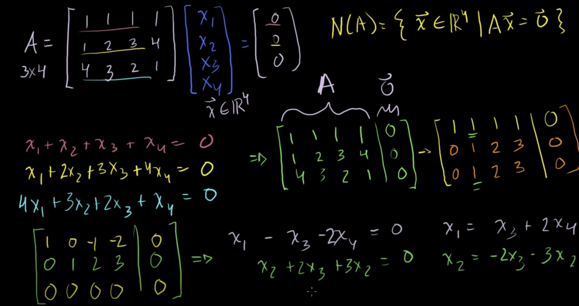 위와 같이 3x4 행렬 A [1 1 1 1; 1 2 3 4; 4 3 2 1]가 있고, A에 곱해서 영벡터를 만드는 벡터 x가 있다고 하자.