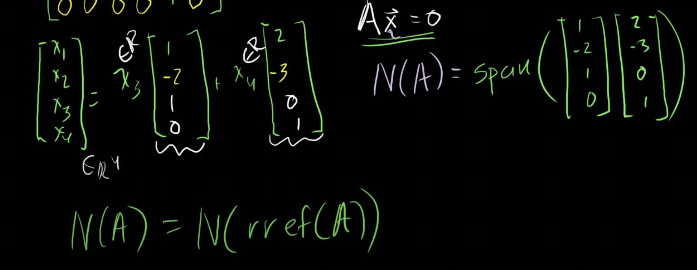 따라서, 방정식 Ax = 0을 만족시키는 R4에 있는 모든 벡터는 이 두 열벡터의 일차결합으로 나타낼 수 있다.