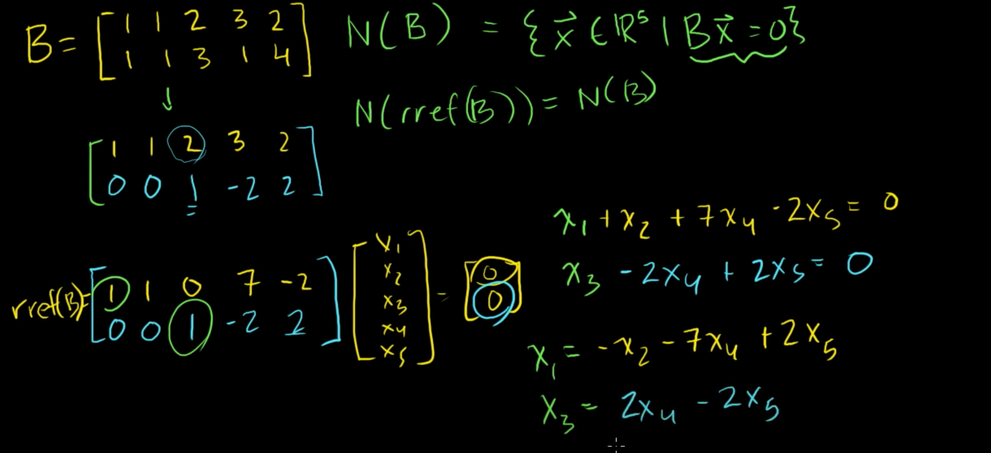 위 식을 다시 써보면, [x1 x2 x3 x4 x5] = x2[-1 1 0 0 0] + x4[-7 0 2 1 0] + x5[2 0 -2 0 1] 이다.
