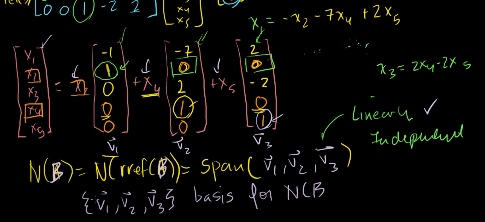 N(B) = N(rref(B)) = span(v1, v2, v3) 가 성립한다.
