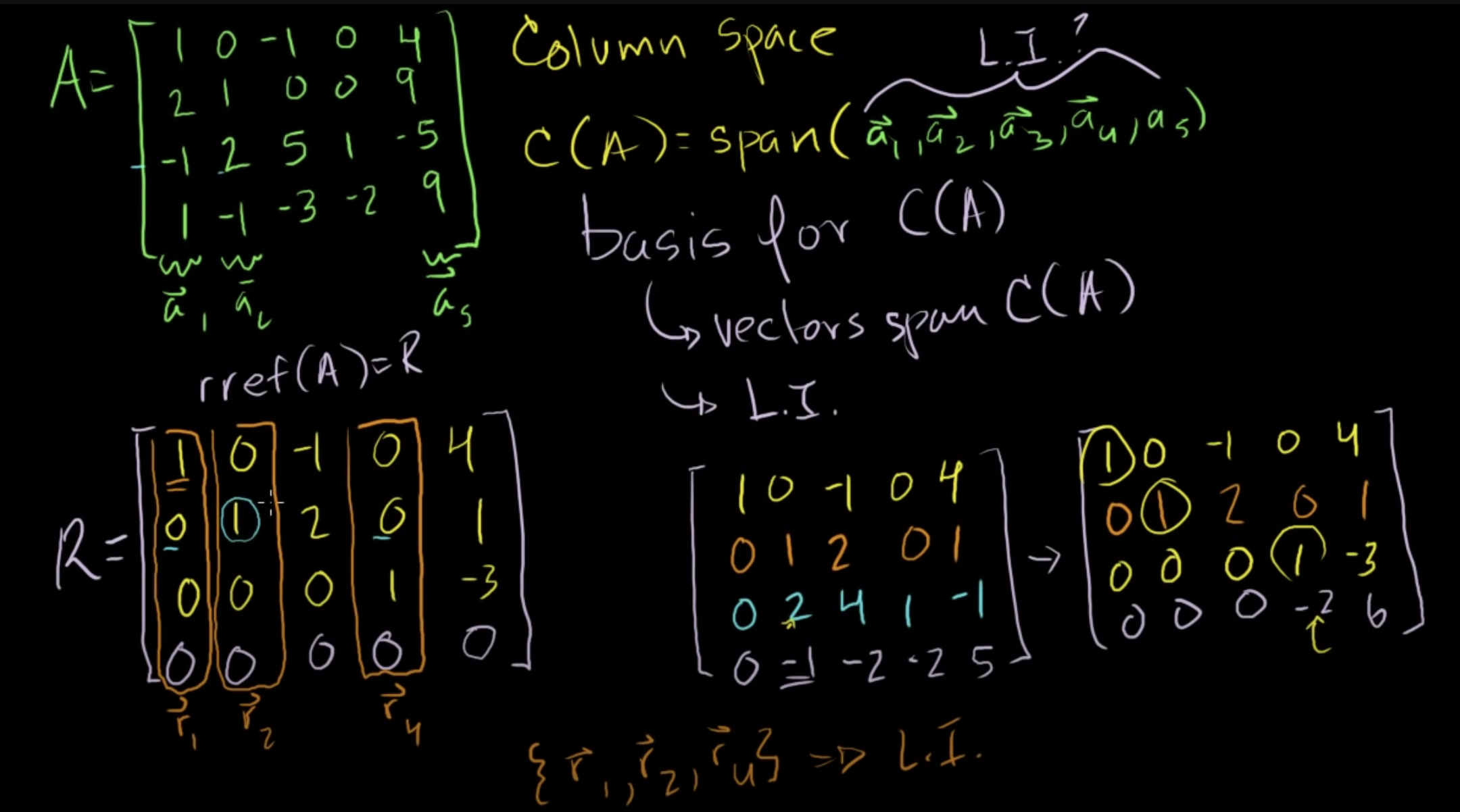 피벗 열들은 선형독립이기 때문에, r1, r2, r4는 선형독립이다.