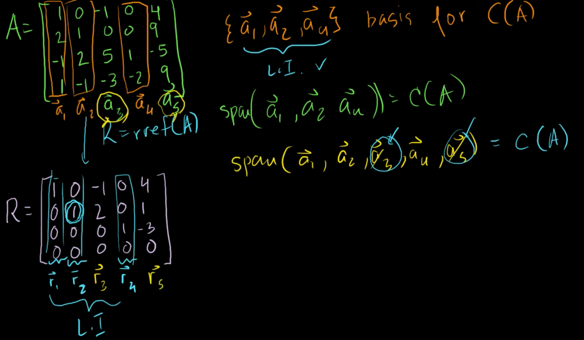 행렬 A와 A의 기약행사다리꼴행렬 R이 있으며, r1, r2, r4는 선형독립이면서 기저이고, 이에 대응하는 a1, a2, a4도 선형독립이면서 열벡터를 생성하는 기저이다. (왜냐하면 R과 A가 같은 영공간을 갖기 때문이다.)